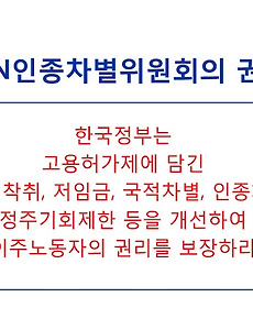 UN인종차별위원회의 권고 : 한국정부는 고용허가제에 담긴 차별, 착취, 저임금, 국적차별, 인종차별, 정주기회제한 등을 개선하여 이주노동자의 권리를 보장하라 싸이의 강남스타일이 세계적으로 유명해 지며, 영국의 UK차트에서 1위를 그리고 빌보드 차트에서 2위를 기록했다고 한다. 전 세계 많은 사람들이 한국에 대해 호감을 갖게 되었고, 또 많은 한국 사람들이 이 소식에 자못 자랑스러워하고 있다. 단순히 싸이 개인의 성공이 아닌, 대한민국 전체의 역량이 커지고 이것이 또 다른 형태로 전 세계 무대에서 증명되었다고 믿는듯 하다. 이즈음 또 한 가지 한국과 관련된 소식이 있었다. 8월 20일~21일, 스위스 제네바에서 열린 UN인종차별철폐위원회에서 한국의 인종차별 상황을 보고받았으며, 8월 31일 ‘한국정부는 인..