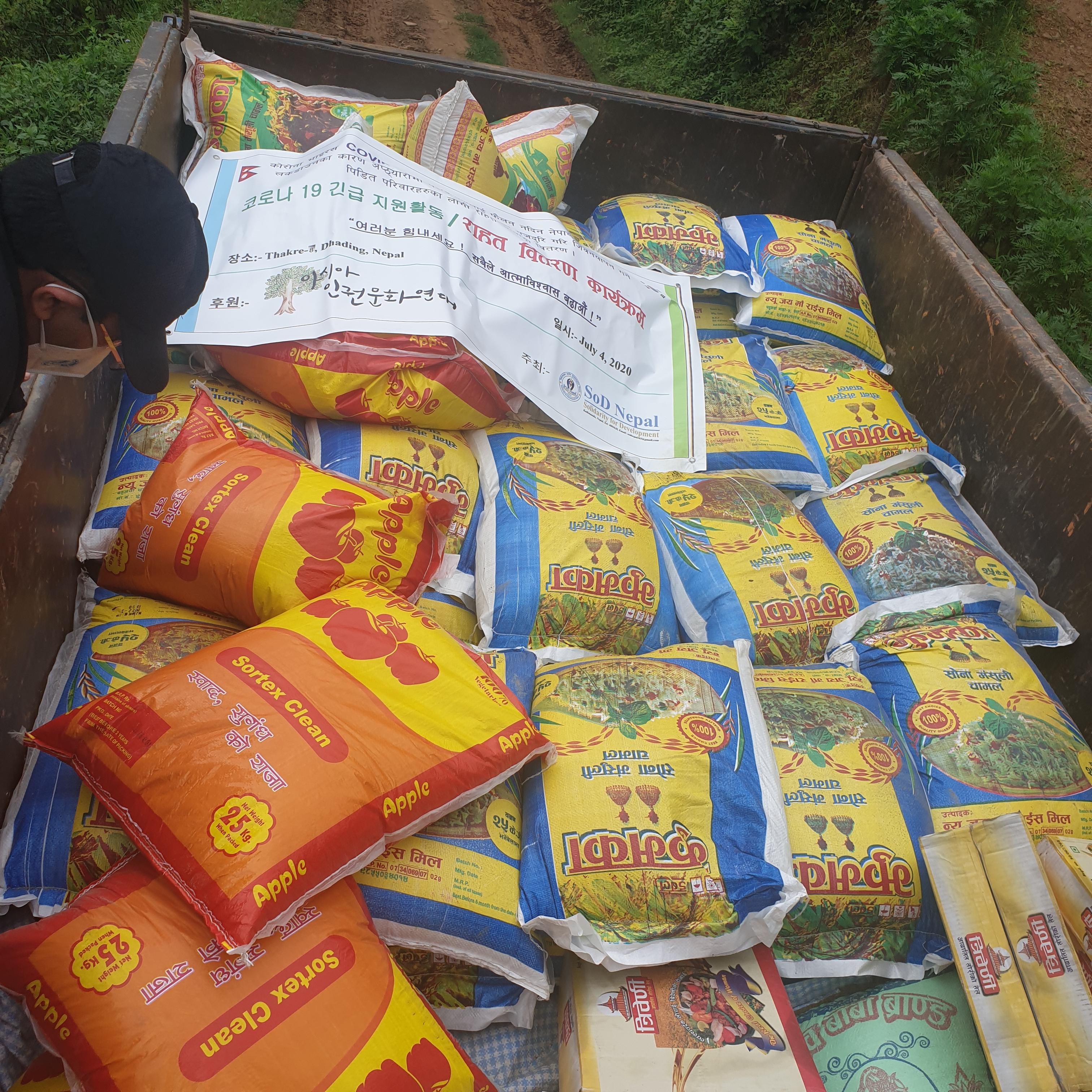 가구당 쌀30kg, 콩(달)2kg, 소금2kg, 식용유2리터, 비누 4개, 마스크 4개를 전했습니다.