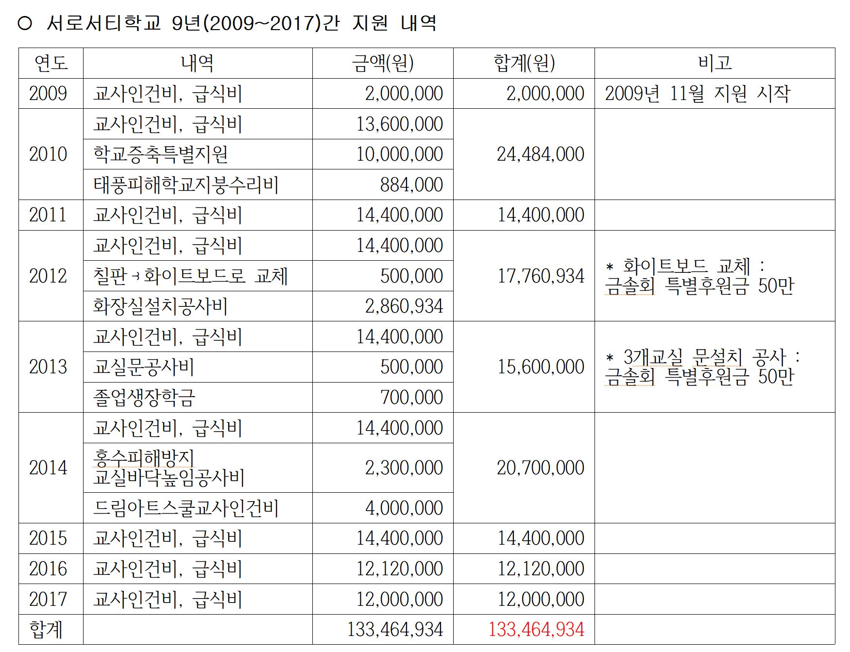 저희 모임에서 지금까지 서로서티초등학교에만 총 1억 3천여만원을 지원하였고, 2018년도부터는 완전 공립학교로 운영되기 때문에 더 이상의 선생님 월급 지원은 하지 않아도 됩니다.
