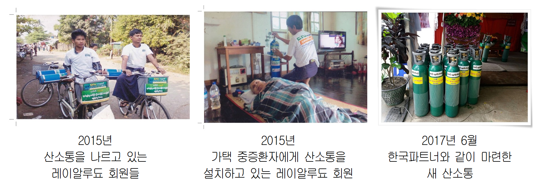 * 레이알루됴의 회원들은 모금 운동과 산소통 배달을 직접 합니다. 배달을 책임진 이들은 이 지역에서 싸이카(손님을 태우는 자전거)를 운전하는 이들입니다. 자기 자전거도 없어서 매일 1천짯(약 900원)에 자전거를 빌려 영업하면서도 산소통 배달은 무료로 자원활동하고 있습니다. 환자가 너무 가난하면 자기 주머니를 털어 쌀을 사주고 집이 지저분하면 청소까지 한다고 합니다.