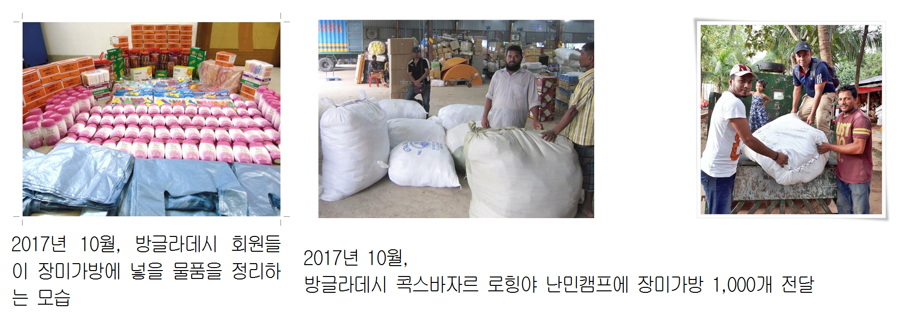 지원금 300만원을 방글라데시로 보내 로힝야 난민들에게 급히 필요한 물품을 공급했습니다. 방글라데시 다카에 있는 프로젝트팀 'Let's stand beside humanity'가 별도 모금운동을 펼쳐 1천달러를 마련하여 우리 네팔사랑이 지원한 300만원과 합쳐 여성을 위한 Dignity Kit(장미가방) 1,000개와 어린이를 위한 간식을 준비했습니다. 물품을 구입하고 정리하고 운반, 배분하는 일을 맡은 이 프로젝트팀은 로힝야난민 지원활동을 하기 위해 일시적으로 운영하는 팀으로, 한국에서 일한 경험이 있는 귀환이주노동자들이 참여하고 있습니다.