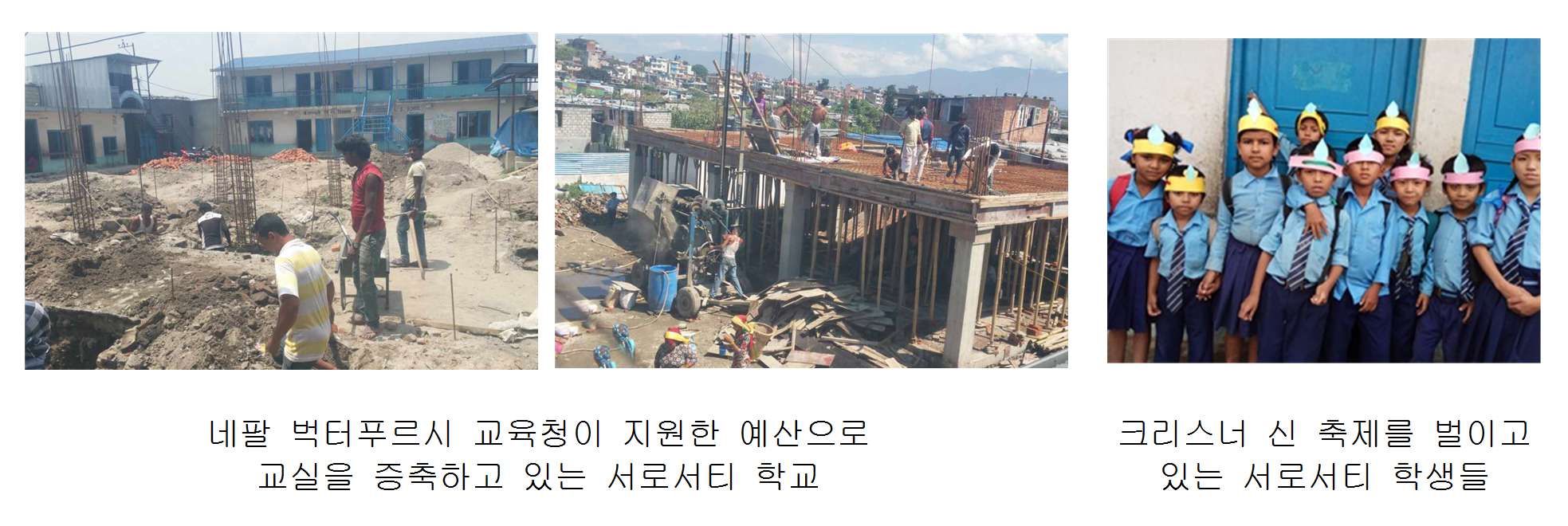 수 십년 전까지 우리나라가 지원을 받던 나라에서 이제는 지원을 해 주는 나라로 발전한 것이 세계에서 유래를 찾아볼 수 없는 경우가 되었듯이 지원을 끝낸다는 것은 참 기쁘고 드문 일입니다. 이제 저희 모임에서 지금까지 지원해 왔던 ‘서로서티초등학교’가 완전 공립학교로 전환되면서 지원을 하지 않아도 될 모양입니다. 이 서로서티초등학교는 네팔의 너른 하천변 모래밭에 무허가 건축물로 만들어진 학교에서 출발한 학교입니다.